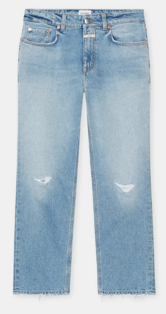 Closed Milo Mid Blue S25 - Our straight fit jeans with a mid-rise waist and straight, cropped leg. Made from Gentle Comfort Stretch Denim (12 oz.) with a twill texture and slight stretch for extra comfort. The denim used comes in a destroyed wash. This is characterized by strong and very authentic effects, usually achieved by hand. The holes at knee height, which are lined, are a good example of this.