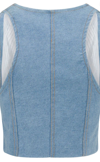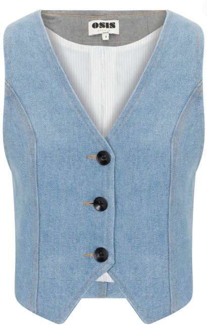 Osis Nana - Classic tailoring meets modern ease in the NANA vest. Designed in a soft, washed blue denim, this structured silhouette features a sharp V neckline, contoured seaming, and a pointed hem that flatters the waist. Finished with bold, oversized buttons and a clean, minimal back, NANA redefines denim as a polished wardrobe staple. Wear it layered over a crisp shirt or on its own for a confident, contemporary look.